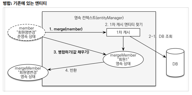 주의: 변경 감지 기능을 사용하면 원하는 속성만 선택해서 변경할 수 있지만, 병합을 사용하면 모든 속성이 변경된다. 병합시 값이 없으면 null 로 업데이트 할 위험도 있다. (병합은 모든 필드를 교체한다.)