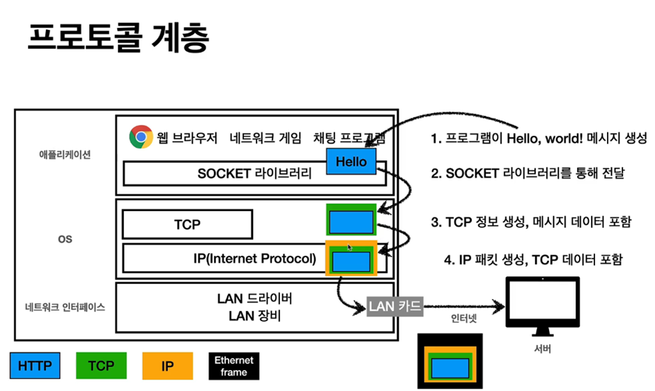 어플리케이션단 프로그램으로 메시지를 전달하면, socket 라이브러리를 통해 전달이 되고 TCP/IP 패킷을 생성한다.