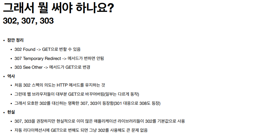 리다이렉트시 요청 메서드가 GET으로 변하고, 본문이 제거될 수 있음(MAY)
