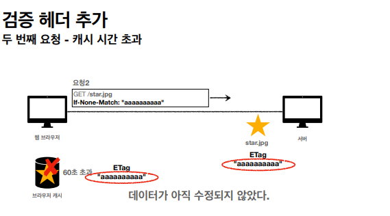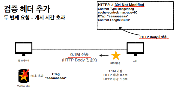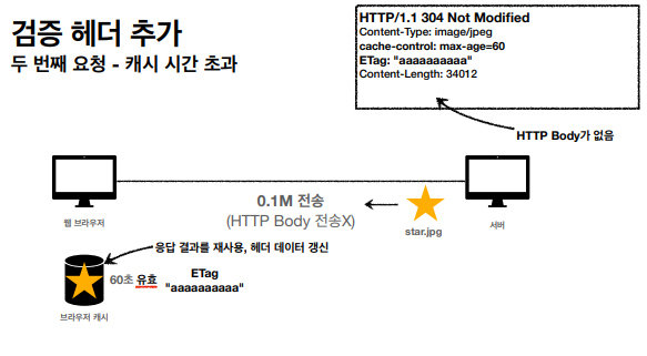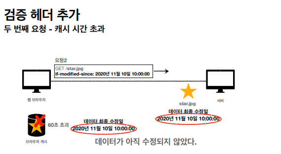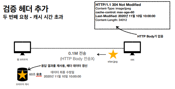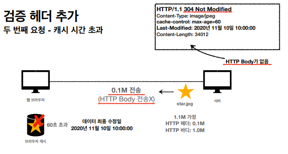 1. 캐시 유효 시간이 초과해도, 서버의 데이터가 갱신되지 않으면 304 Not Modified 코드를 반환하고 바디 정보를 넘기지 않는다. (헤더 데이터만 처리)