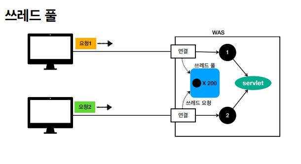 - 멀티 쓰레드에 대한 부분은 WAS가 처리