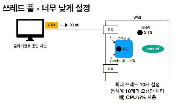 - 이 값을 너무 낮게 설정하면? 동시 요청이 많을 때 CPU 점유율은 낮고 클라이언트는 응답 지연