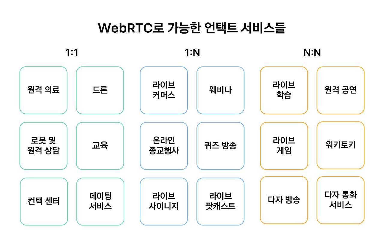 WebRTC는 주로 1:1, 1:N, N:N의 통신을 지원하는 서비스에서 활용된다.