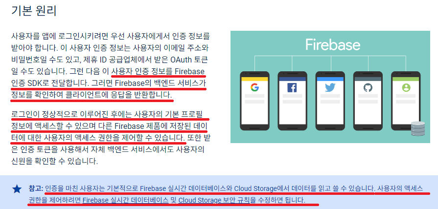 Firebase의 공식 문서에 따르면, Firebase Auth에서 자체 백엔드 서버를 이용하여 인증을 처리해주고 있다고 한다. 또한 인증을 마친 사용자는 데이터베이스에 접근하여 데이터를 읽고 쓸 수 있다고 되어 있다.
