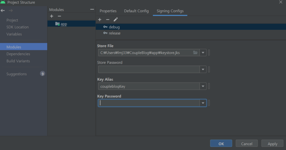 StoreFile에 jks 경로를 StorePassword, KeyPassword에 위에 추가한 패스워드 입력, Alias도 입력.