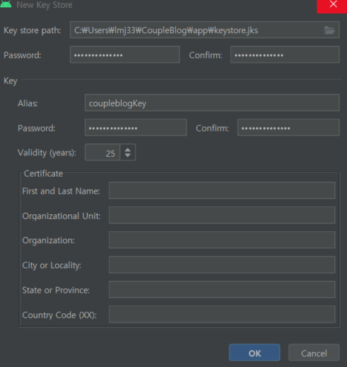 jks 파일은 프로젝트 내의 app 폴더에 생성되도록 지정한다. (이름은 따로 정한다)