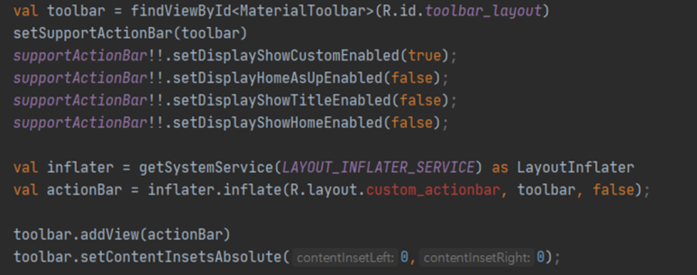 stackover flow를 찾아보니까, Toolbar를 찾아와서 거기에 직접 자식을 넣고 inflate하는 방식, 속성 처리..