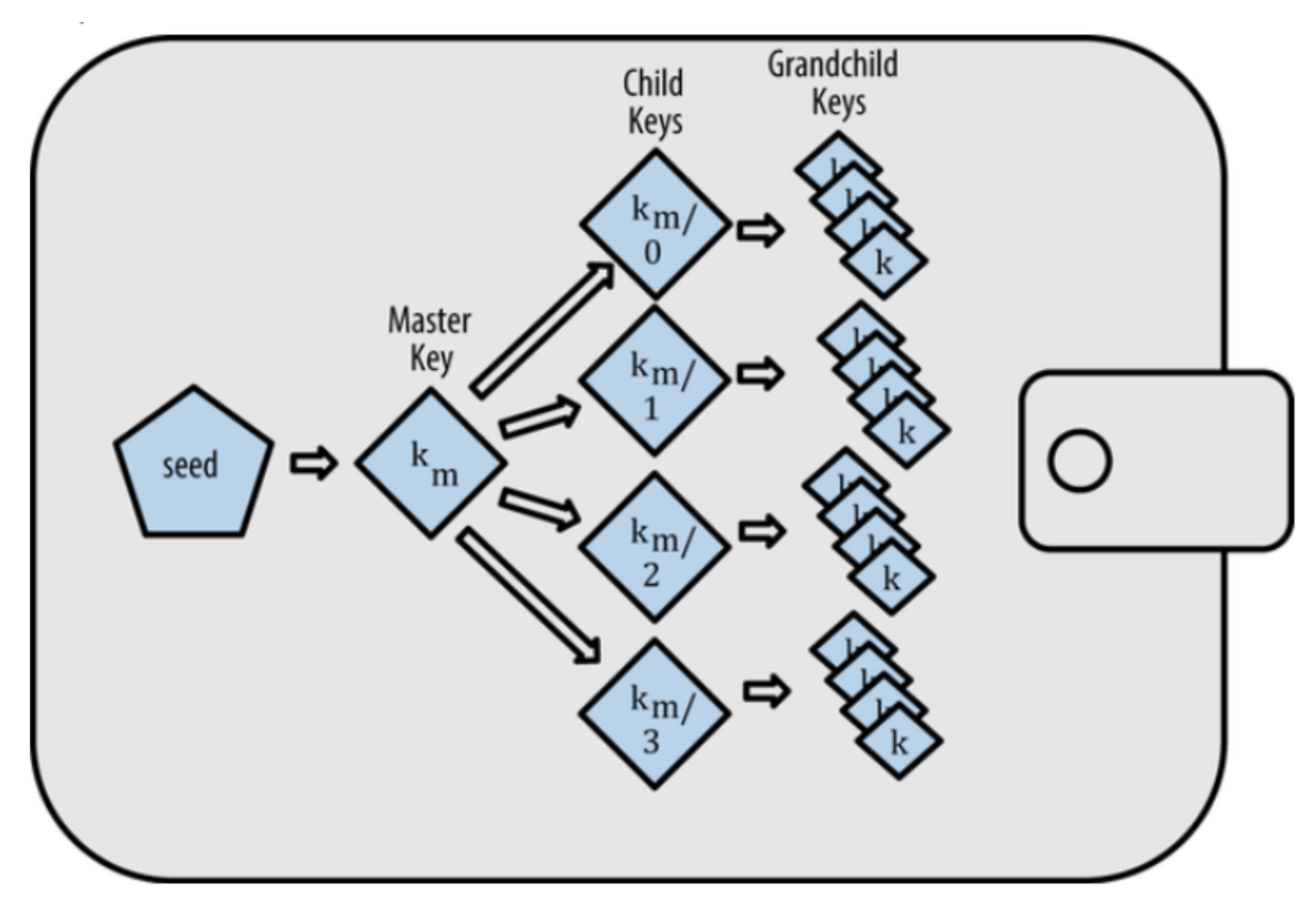 HD지갑은 128, 256, 512 비트 크기의 무작위 숫자인 root seed 한 개로부터 생성된다. root seed는 연상기호 단어열로 가장 흔하게 표현된다. root seed는 HMAC-SHA512 함수에 입력되고 해시값을 이용하여 마스터 개인키(m)와 마스터 체인코드를 생성한다. 표준 타원곡선 곱셈법(공개키를 구할 때 사용) m * G를 사용하여 마스터 공개키(M)을 구한다.