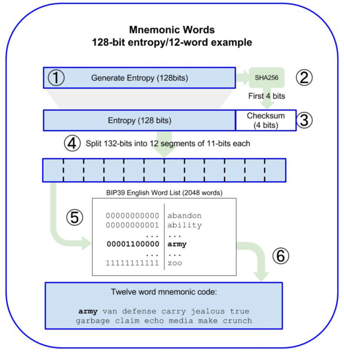 bip39에서 연상기호와 시드의 생성 과정을 다음과 같이 규정한다.