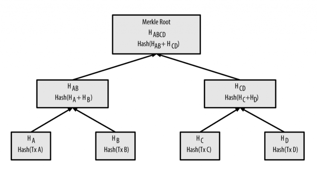 비트코인 블록체인 내 블록 각각은 머클 트리를 이용해서 해당 블록에 들어있는 모든 거래의 요약본을 가지고 있다. 머클 트리는 이진 해시 트리라고도 하는데, 규모가 큰 데이터 집합의 완전성을 효울적으로 요약하고 검증하는 데 사용되는 데이터 구조다. 머클 트리는 블록 내에 있는 모든 거래를 요약하기 위해 비트코인에서 사용되며, 거래의 전체 집합에 대한 모든 디지털 지문을 만들어 내고, 특정 거래가 블록 내부에 포함되는지 여부를 검증하는 데 매우 효율적인 프로세스를 제공한다. 루트 혹은 머클 투르라고 부르는 해시 하나가 남을 때까지 노드 쌍을 반복적으로 해싱하여 머클 트리를 만든다.
