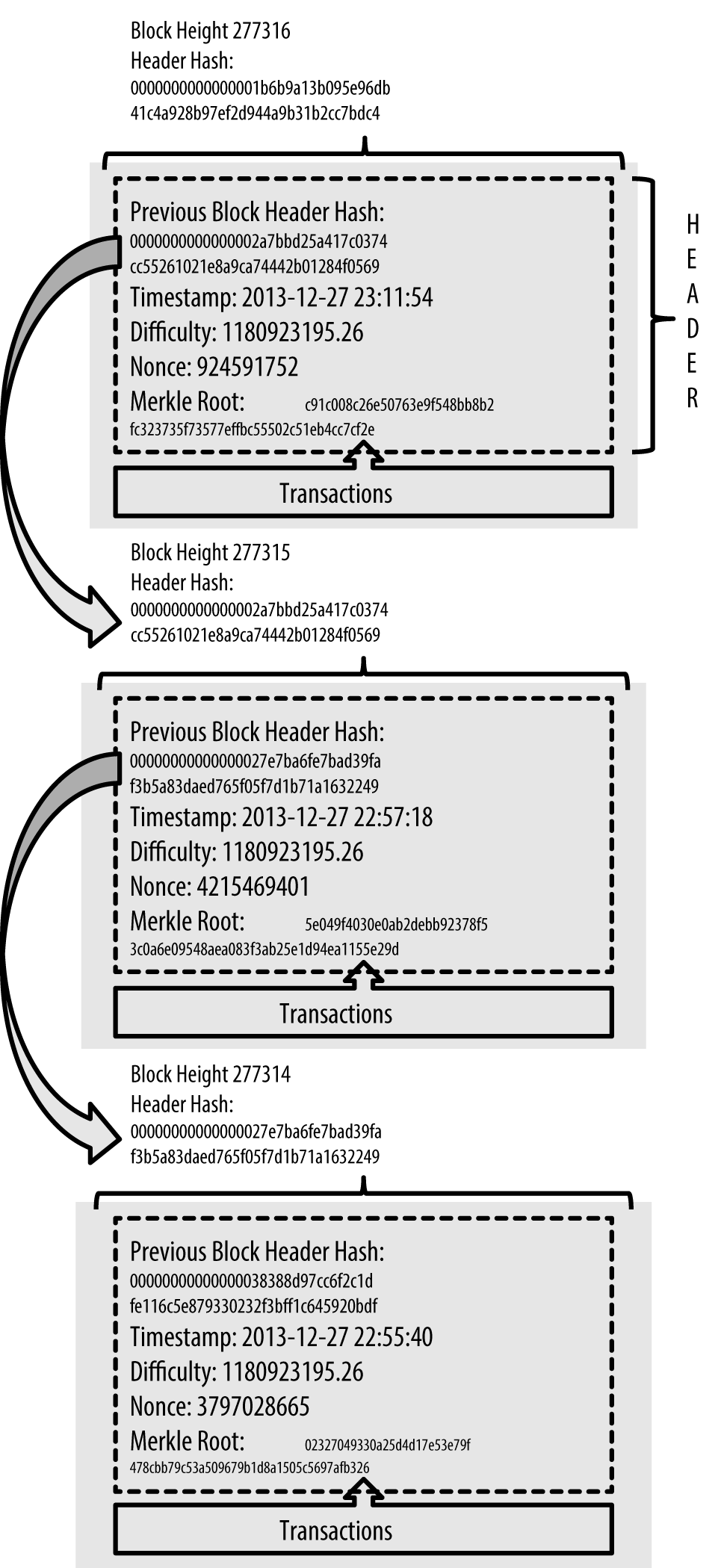 블록체인 데이터 구조는 거래가 담겨있는 블록이 그 이전 블록과 연결되어 있는 형태의 정돈된 목록이다. 블록체인 내에 있는 블록 각각은 해시를 이용해서 식별된다. 해시는 블록의 헤더에서 SHA256 해시 알고리즘을 이용해서 생성된다. 각 블록은 블록헤더에 있는 '이전 블록 해시' 필드를 통해 이전 블록(부모 블록)을 참조한다.