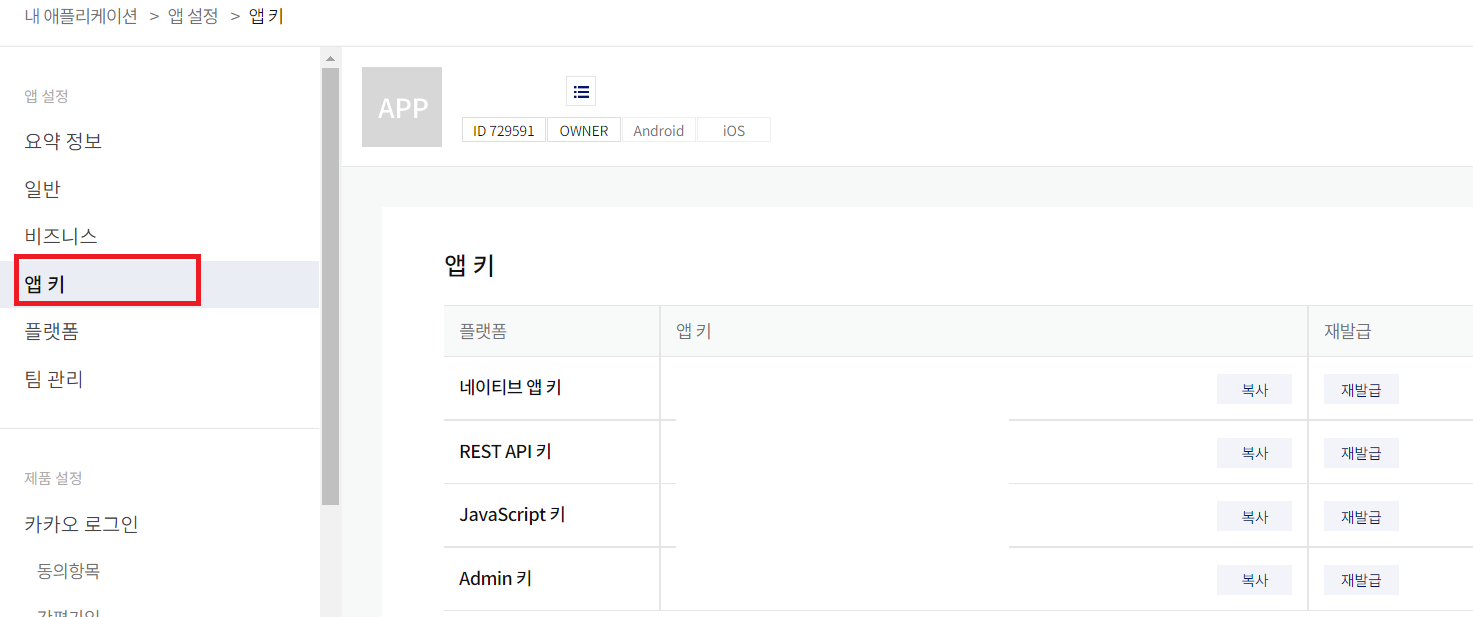 [내 어플리케이션] > [앱 키]를 통해 Native키를 알 수 있습니다.