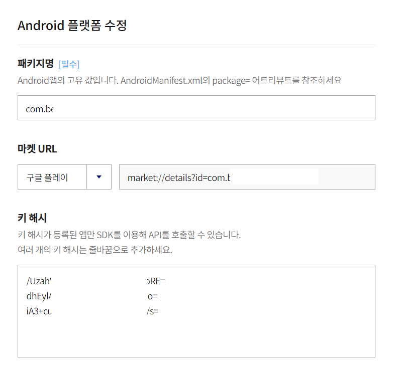 이렇게 얻은 키를 Android 해시키 부분에 등록해 줍니다.