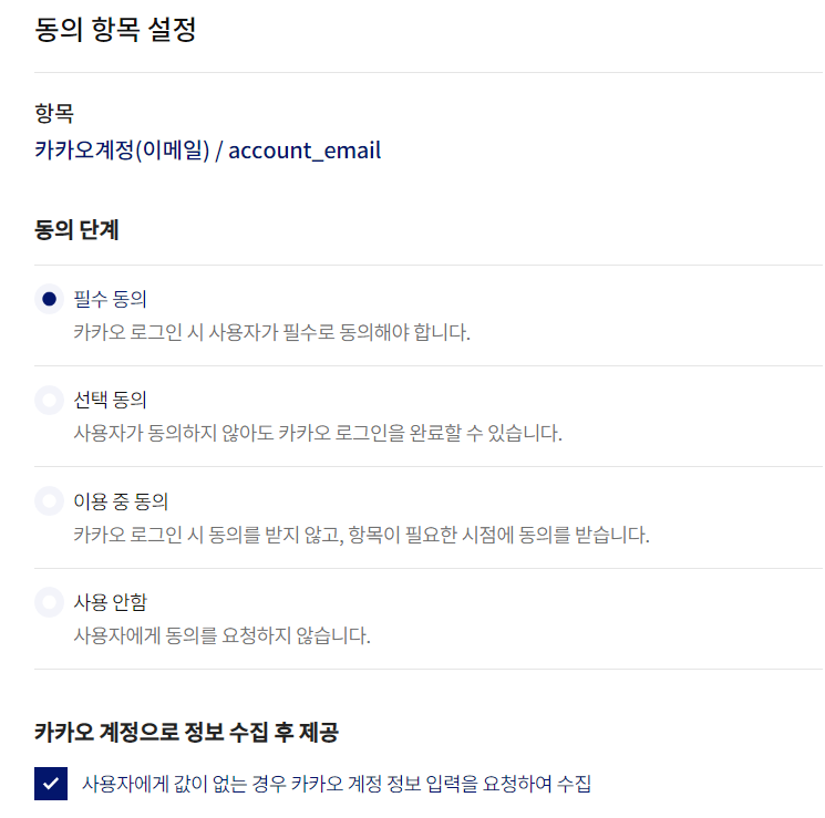 밑에 동의 항목을 클릭하면 카카오 로그인을 통해서 유저로부터 받을 수 있는 정보에 대한 설정을 할 수 있는데,