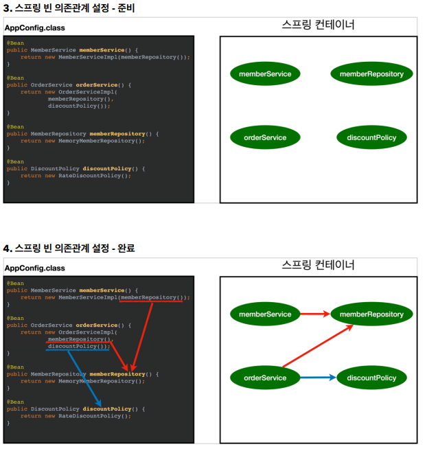 스프링은 빈을 생성하고, 의존 관계를 주입하는 단계가 나누어져 있따. 자바 코드로 스프링 빈을 등록하면 생성자를 호출하면서 의존 관계 주입도 한번에 처리된다.